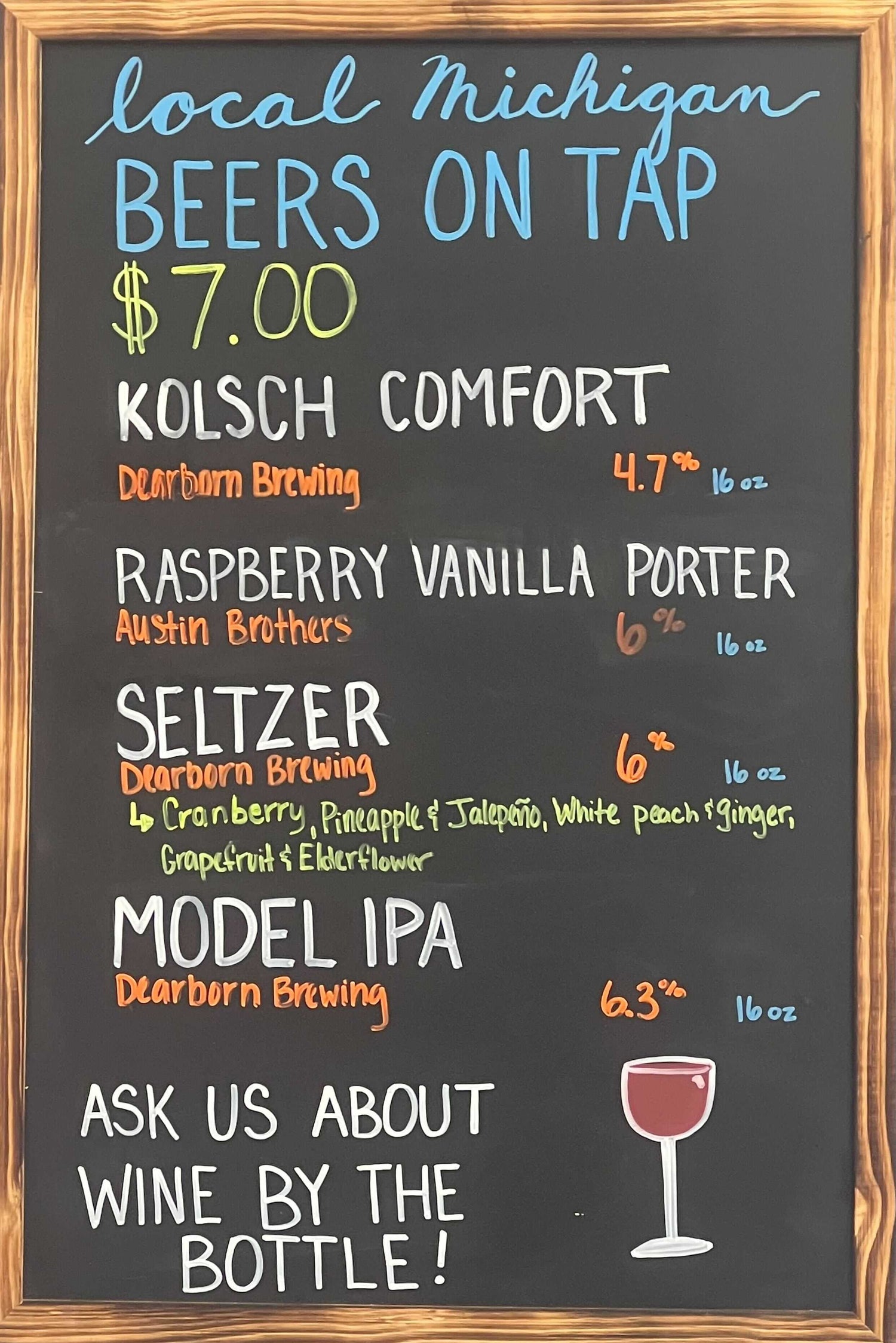 Beers proudly sourced from Michigan. Wine available by the bottle.