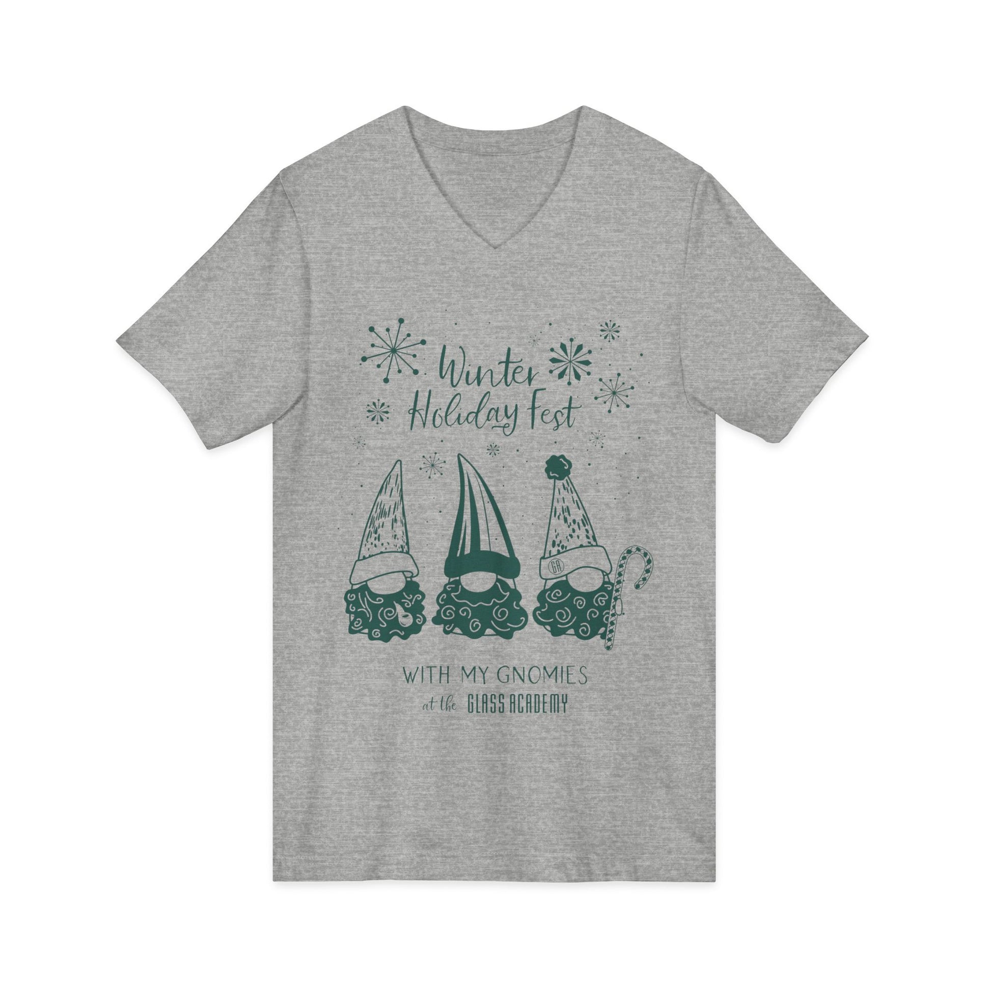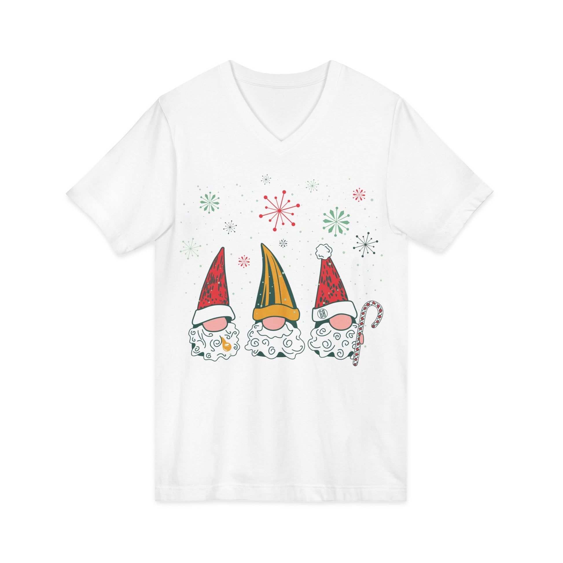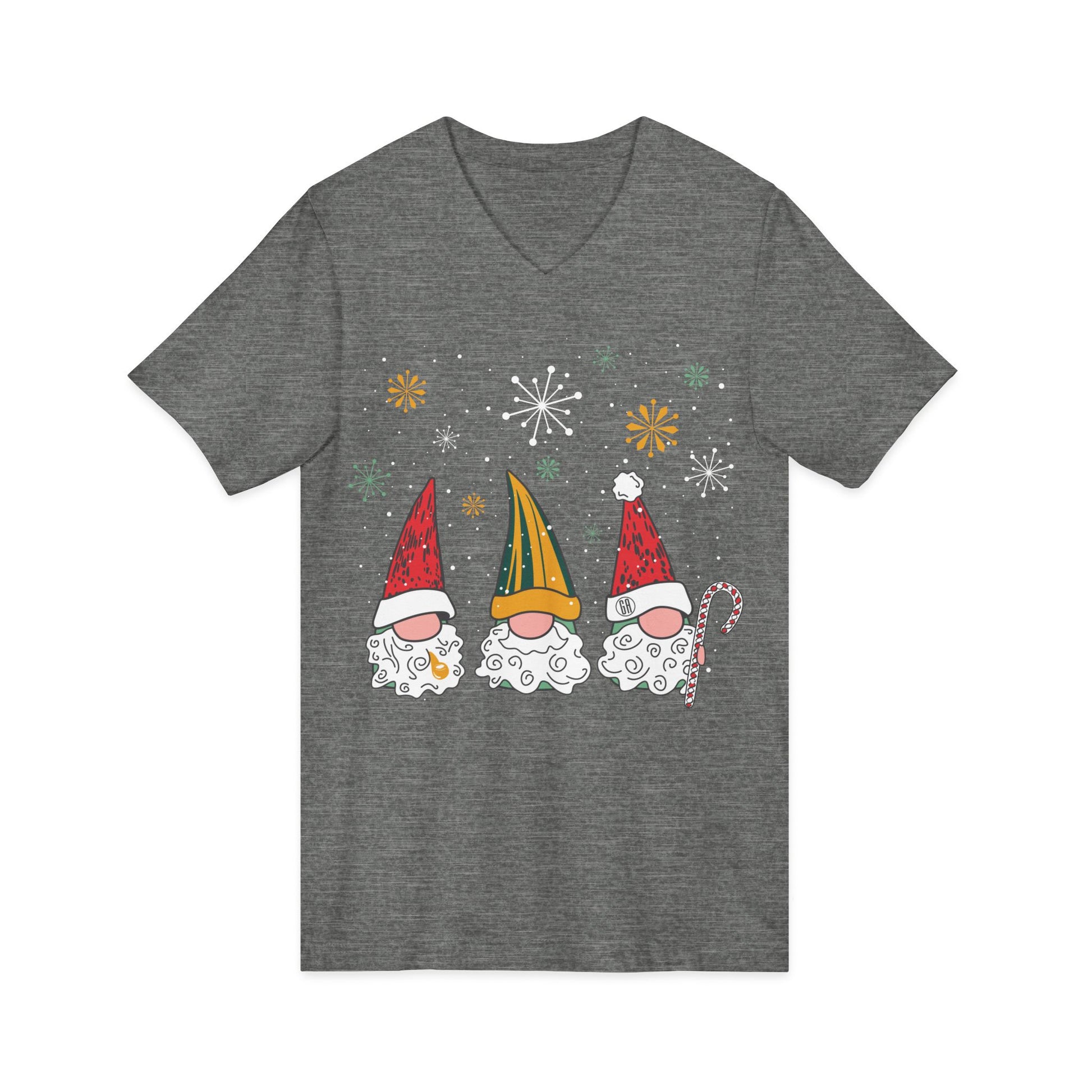 Soft, lightweight V-neck tee featuring three whimsical gnomes in festive hats and swirling patterned beards. The graphic sits centered on a clean background, with snowflake accents that lend a joyful holiday vibe. The V-neck silhouette is easy to layer under jackets or over long sleeves on chilly mornings. Breathable 100% cotton (or blended heather options) and side seams hold the shape wash after wash. Made in humane, certified facilities and finished with a tear-away label for comfortable wear.