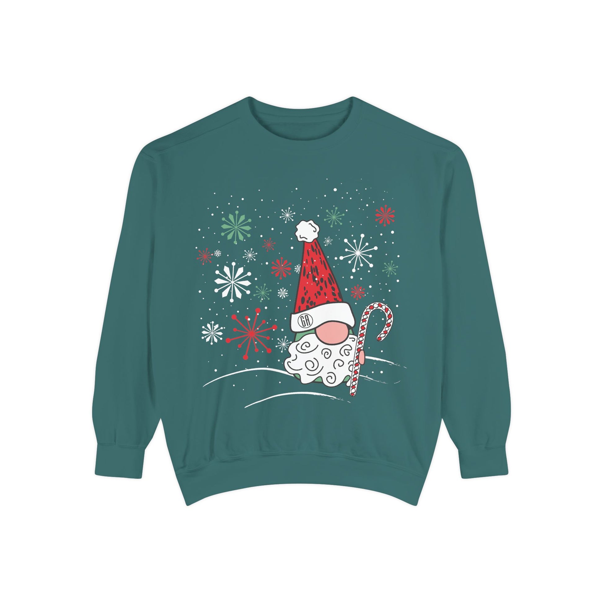 This relaxed-fit sweatshirt brings cozy winter cheer. The soft, medium-heavy ring-spun cotton blend feels substantial and warm, while the garment-dyed finish gives a lived-in, vintage vibe that pairs naturally with jeans or lounge pants. A playful Santa Gnome with a candy cane and festive snowflake bursts sit centered on the chest, adding a charm that feels both whimsical and low-key. Details like the half-moon neck patch; sewn-in twill label; and ribbed collar, cuffs and hem help the sweatshirt hold its shape through repeated wear. OEKO-TEX low-impact dyes and quality construction mean it wears well and feels cozy to the touch — good for slow mornings by the tree or casual holiday gatherings where comfort matters more than fanfare.
