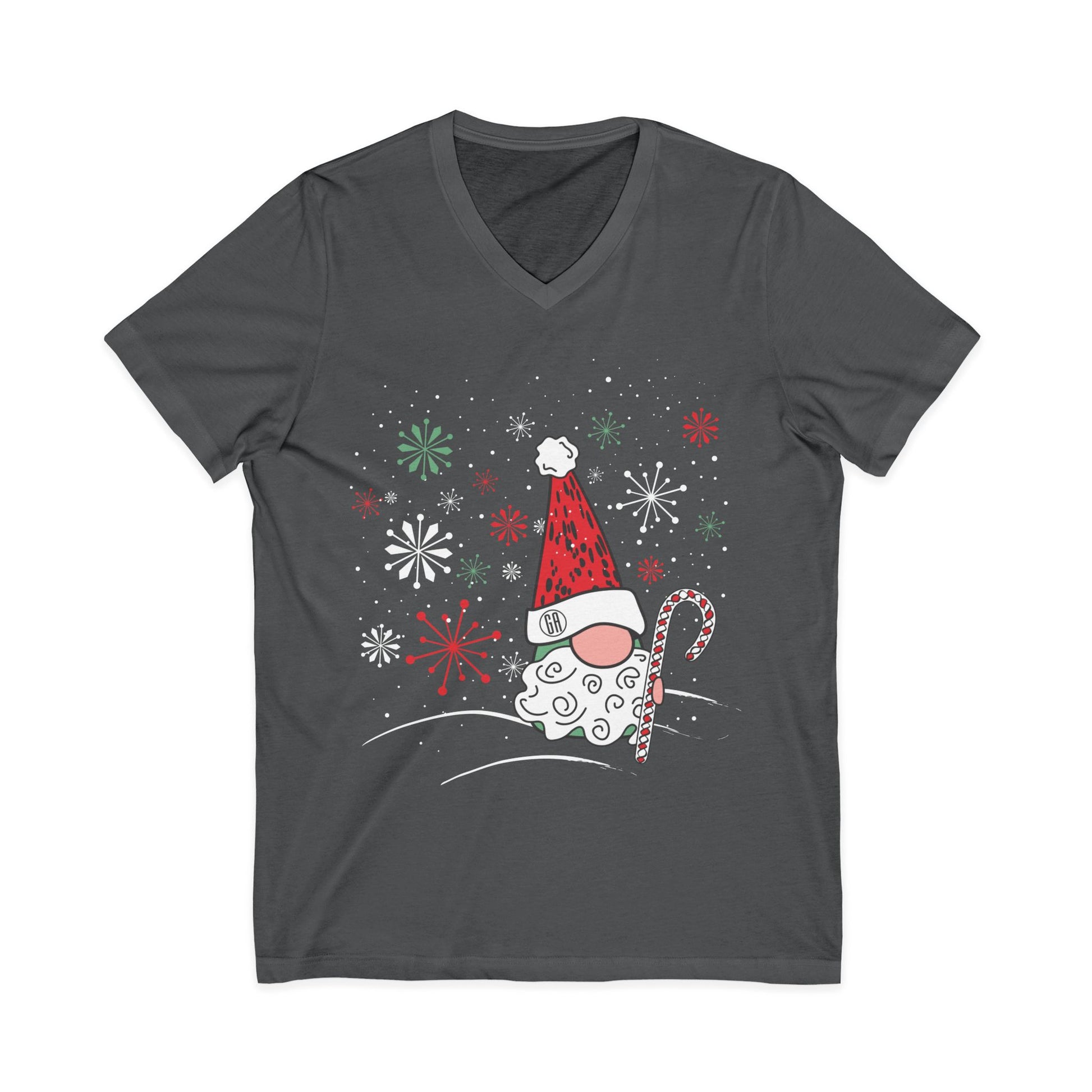 A soft, lightweight V-neck tee that brings a playful, modern twist to holiday wear. The tee showcases a whimsical Santa Gnome holding a candy cane and surrounded by snowflakes. The shirt drapes with a retail fit and stays comfortable all day thanks to breathable 100% cotton (or cotton-blend heathers), a ribbed knit collar that retains shape, and shoulder tape that prevents stretching. Ethically made and low-impact, this tee pairs easily with jeans or layered under a cardigan for cozy seasonal gatherings or casual winter outings.